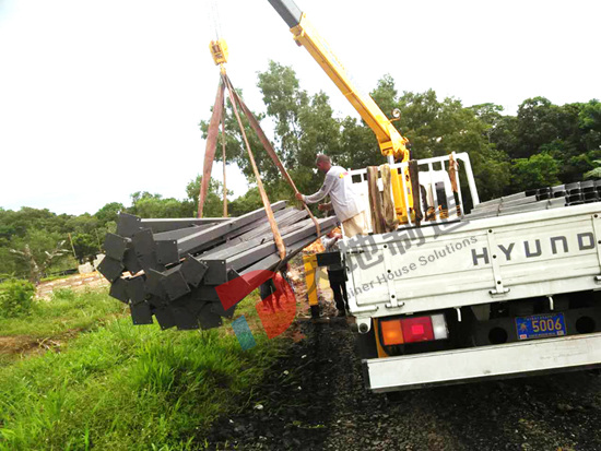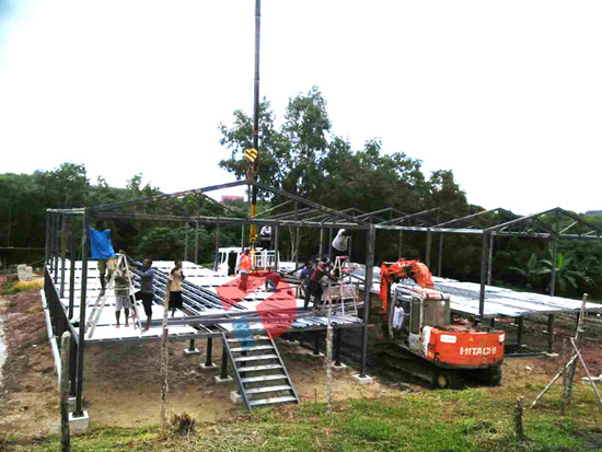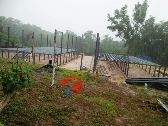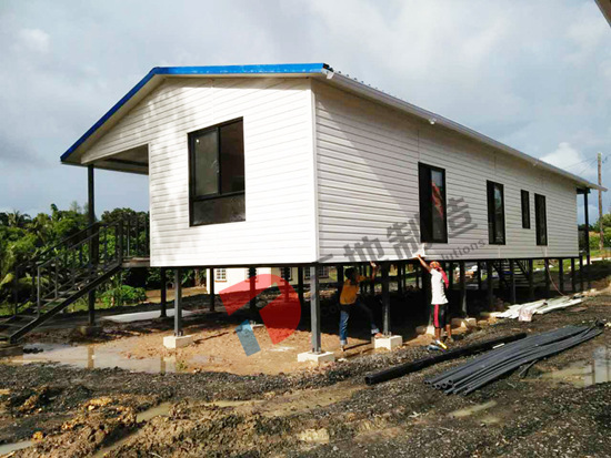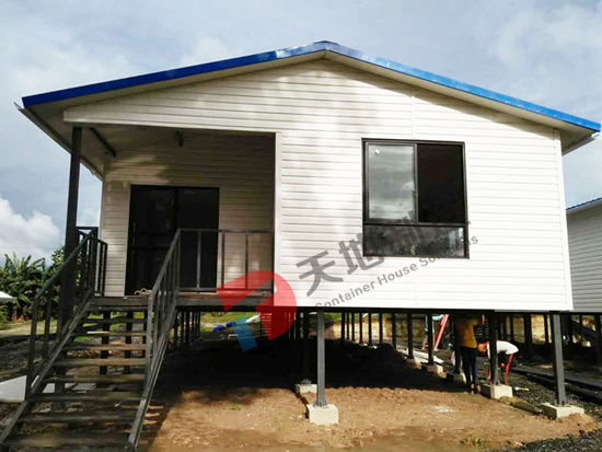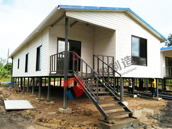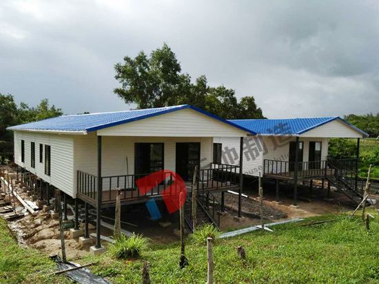 帕勞活動(dòng)房項(xiàng)目以鋼結(jié)構(gòu)為骨架,夾芯板做墻體,屋頂鋪設(shè)彩鋼瓦,用料簡(jiǎn)單卻不失堅(jiān)固,既能抵御肆虐的臺(tái)風(fēng),又能很好地防雨防潮;且又因帕勞屬于熱帶氣候,常年高溫,暴雨又經(jīng)常傾盆而至,蘇州天地的設(shè)計(jì)師便為活動(dòng)房畫上雙腳,讓它如同傣族的竹樓一樣底層架空,上層住人。
